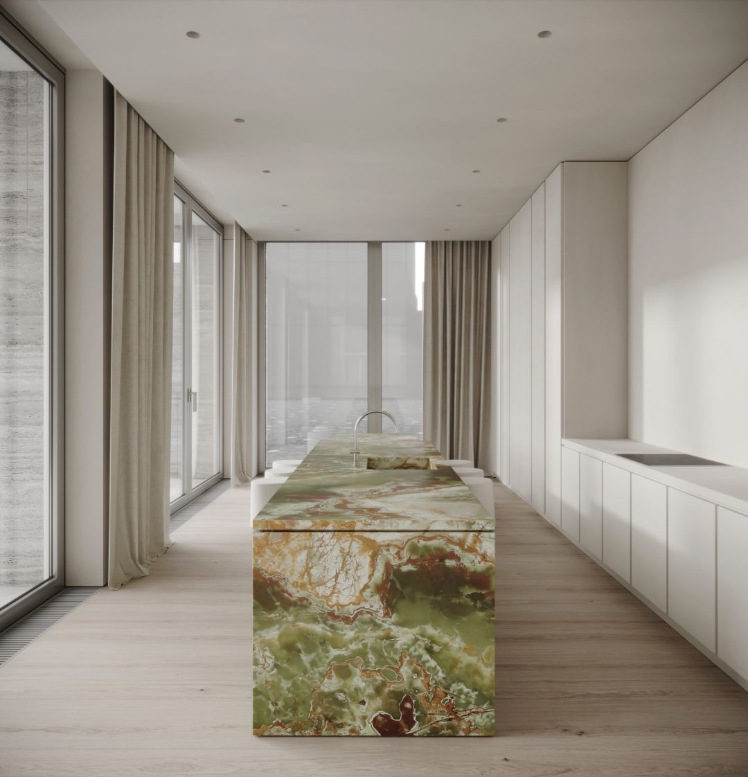 с применением мрамора и ценных пород дерева. На кухне встроена бытовая техника Miele и кухонные модули Rossana. Стены и пол ванных комнат выложен мрамором Pietra Grey, установлен санфаянс Gessie
